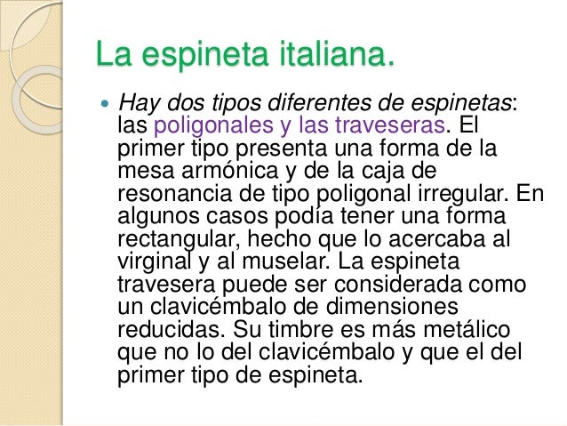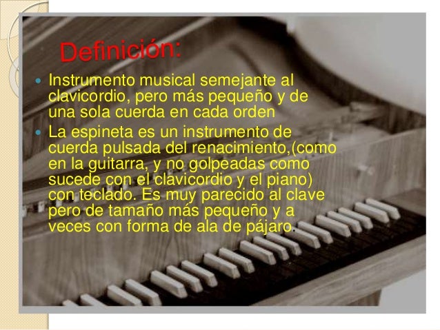 La espineta es un instrumento de tecla de la familia del clavecín, en el cual las cuerdas se pulsan mediante plectros. Por su parte, el piano se parece al clavicordio, en el cual las cuerdas se percuten mediante martilletes. A diferencia del clavecín, en la espineta a cada sonido asociado a una tecla, le corresponde una sola cuerda. Su mecanismo consiste en una serie de palancas verticales provistas de plectros o puntas de pluma, las cuales pulsan las cuerdas al presionar las teclas con los dedos. Las cuerdas son cortas y dispuestas en diagonal dentro de la caja. Existen espinetas de dos teclados, que se colocan uno sobresaliendo por debajo del otro como en el órgano.